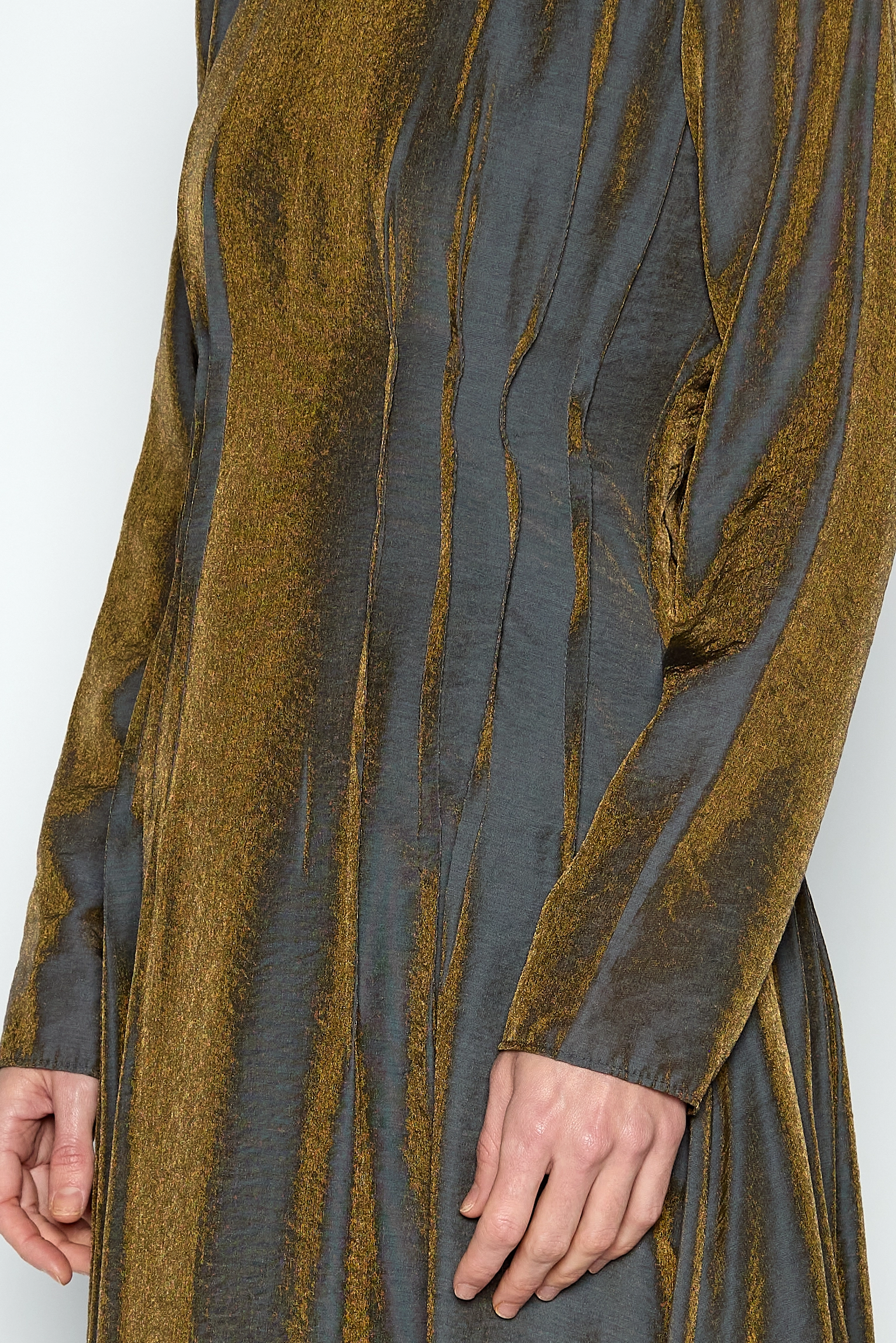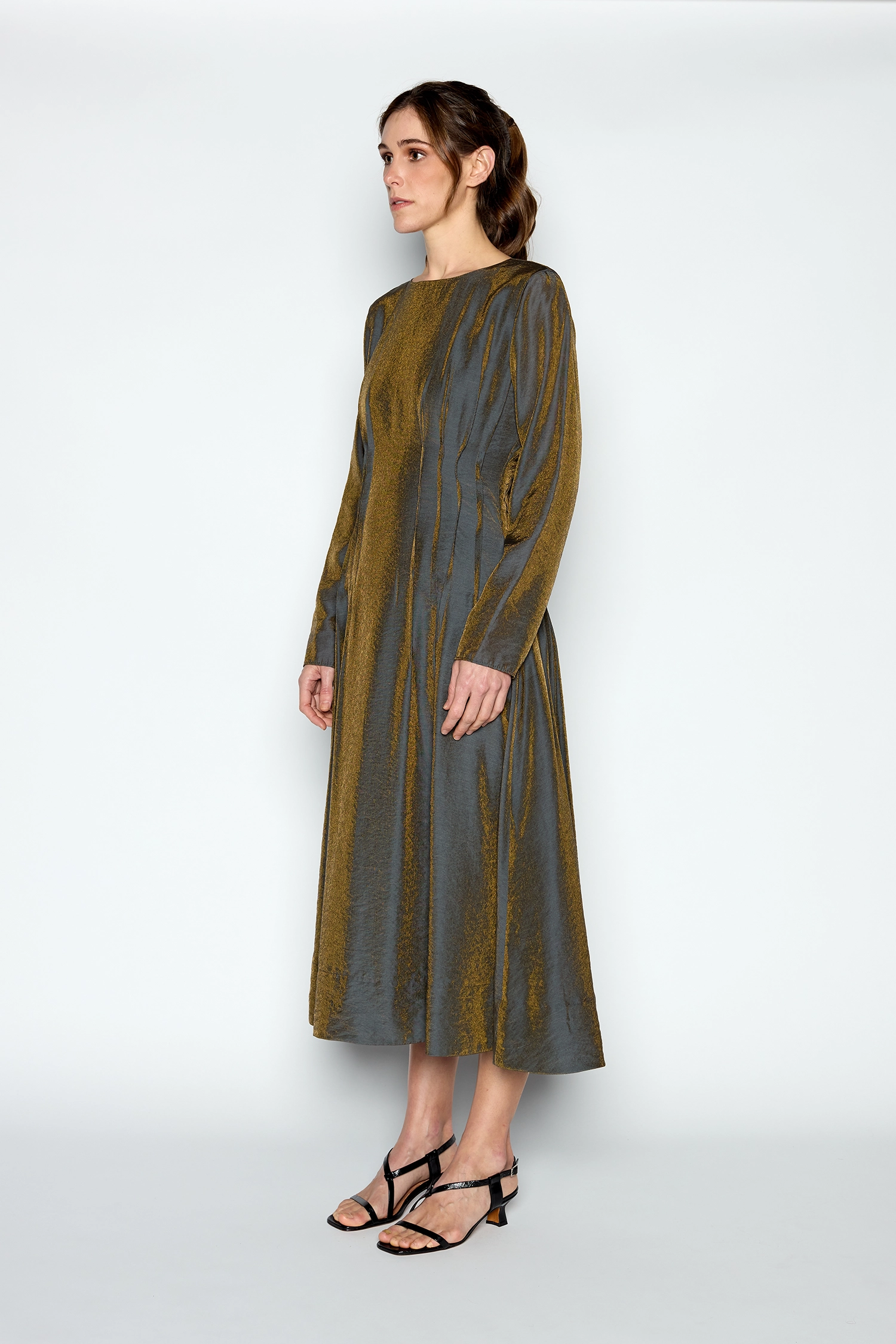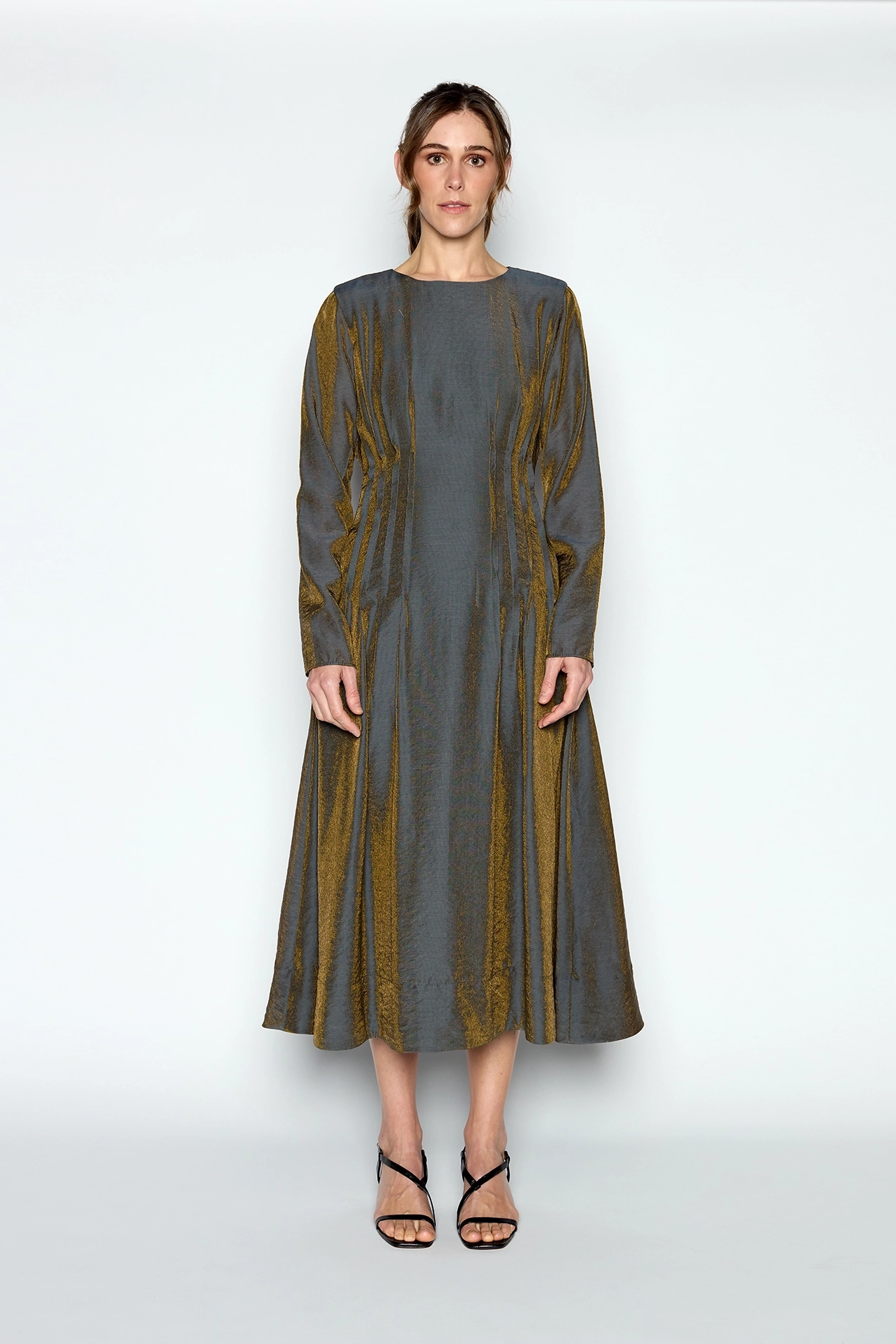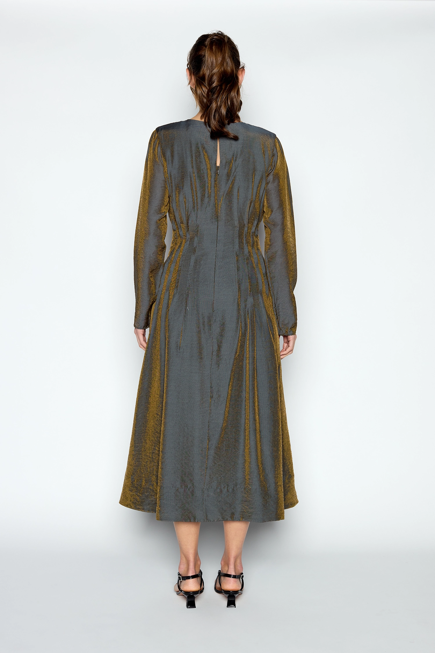 A classic midi dress featuring a round neckline, elegant long sleeves, a center-back zipper, and pleated detailing along the sides of the torso to define the waist. Crafted from iridescent lightweight fabric.