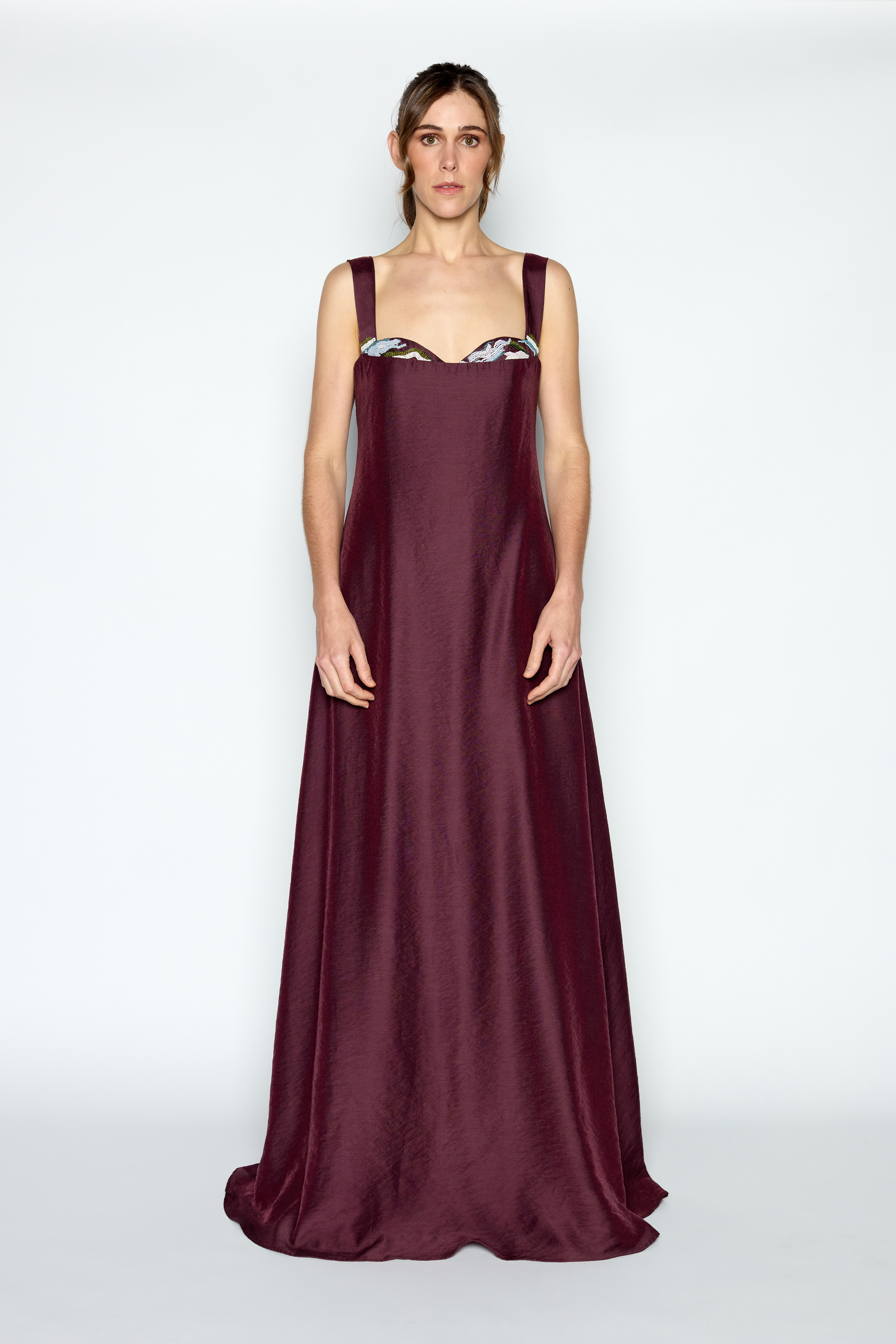 An elegant full-length gown featuring delicate hand embroidery on the bust, an internal fitted bodice for support, a flowing A-line skirt, and a convenient center-back zipper.