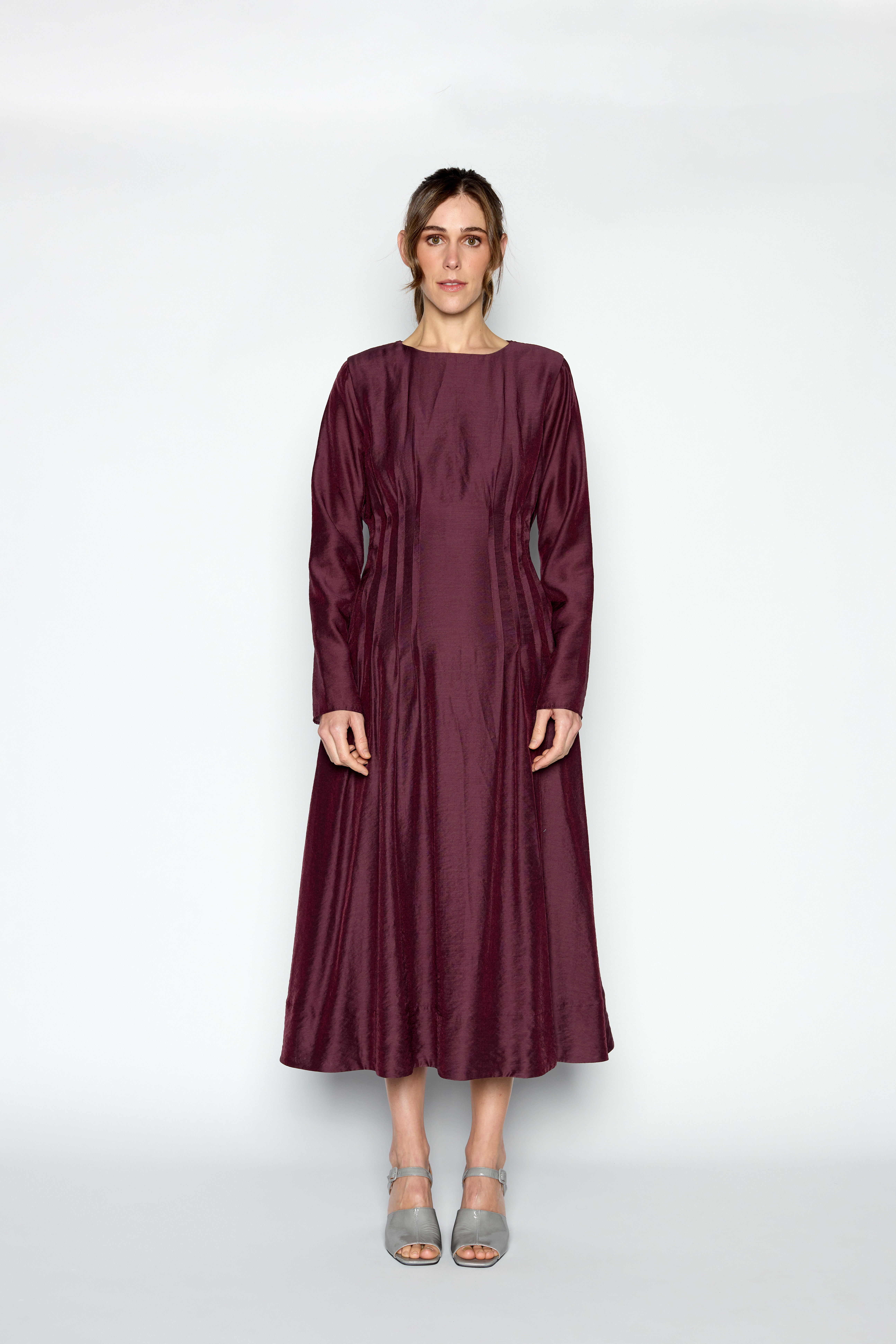 A classic midi dress featuring a round neckline, elegant long sleeves, a center-back zipper, and pleated detailing along the sides of the torso to define the waist. A timeless piece, perfect for any occasion.