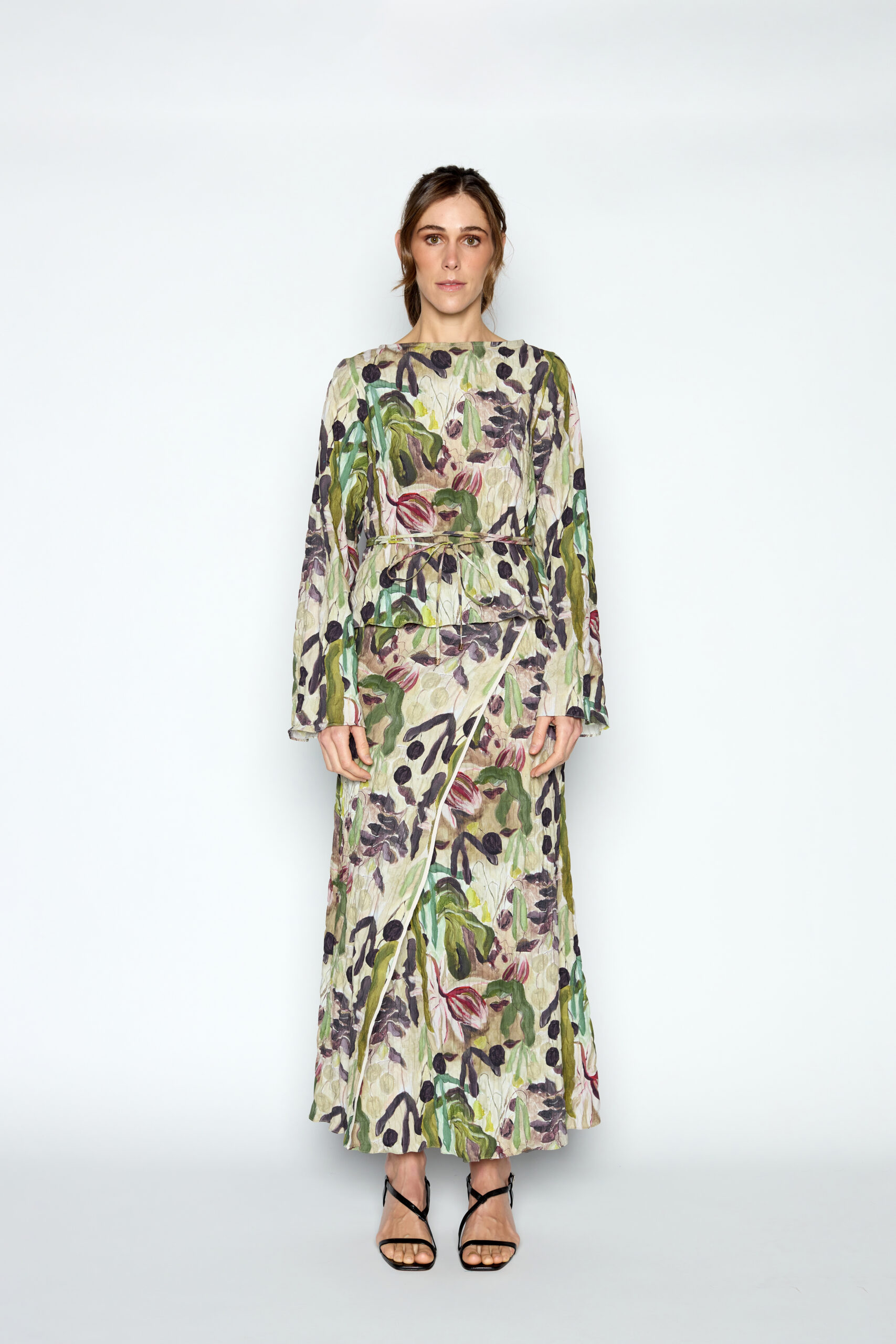 and long sleeves. Crafted from ruched cotton, this piece creates the illusion of a painted canvas.